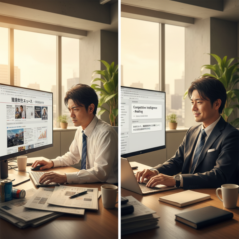 毎週月曜の競合情報収集に数時間かかっていませんか?ChatGPTを使った自動ブリーフィング生成の具体的な手順と実際のプロンプト例を紹介。週次の競合調査を30分に短縮する方法を解説します。